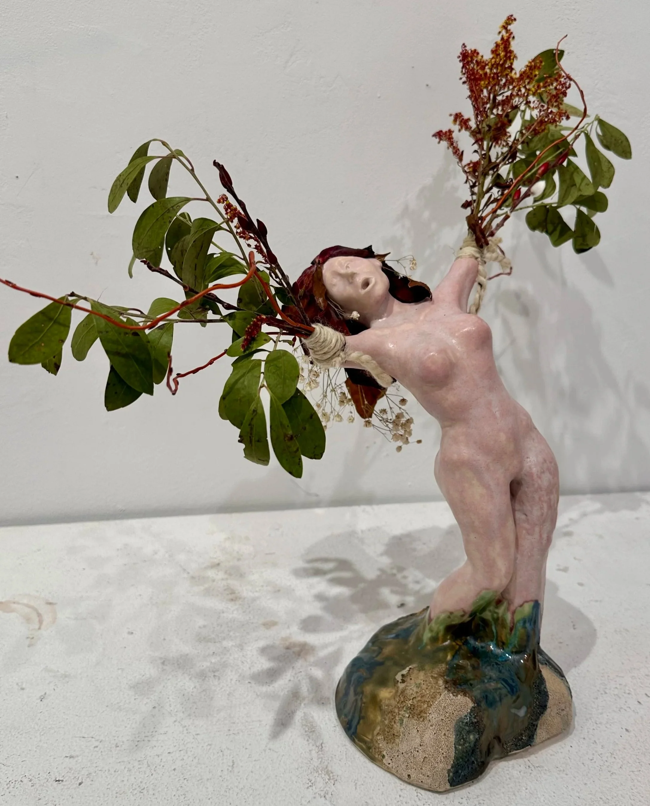 Daphne II, 2024, glazed stoneware, twine, found florals